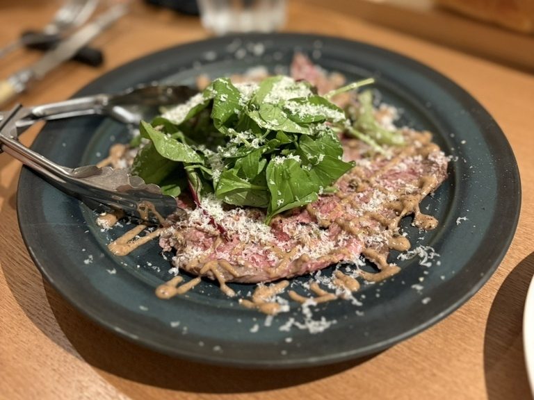 リゾットの他に、表面を加熱した牛肉を薄く伸ばしてカルパッチョにした「牛タタキの叩き 黒ニンニクのマヨネーズ」(1,600円)や、パンチの利いたサイズのメイン料理「骨付き味麗豚ロースのコトレッタ」(3,500円)もおすすめです。