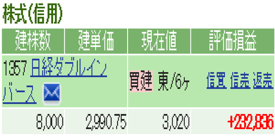いやあ、日経平均強いですねえ。どこまで戻すんでしょうか?26週線くらいまでかなあ。その辺までゆったりと待って、持ち合いを下離れしそうなところでまたダブルインバースかなあ。 あ、ダブルインバースは結局先々週の金曜日にすでに売却済みで、100万程度を取り返すことができました。 先々週、急激に円高になって、金曜のマーケットはもっとど~んと下がるかなと思ってみてましたが、なかなか底固く後場にかけて戻してき...