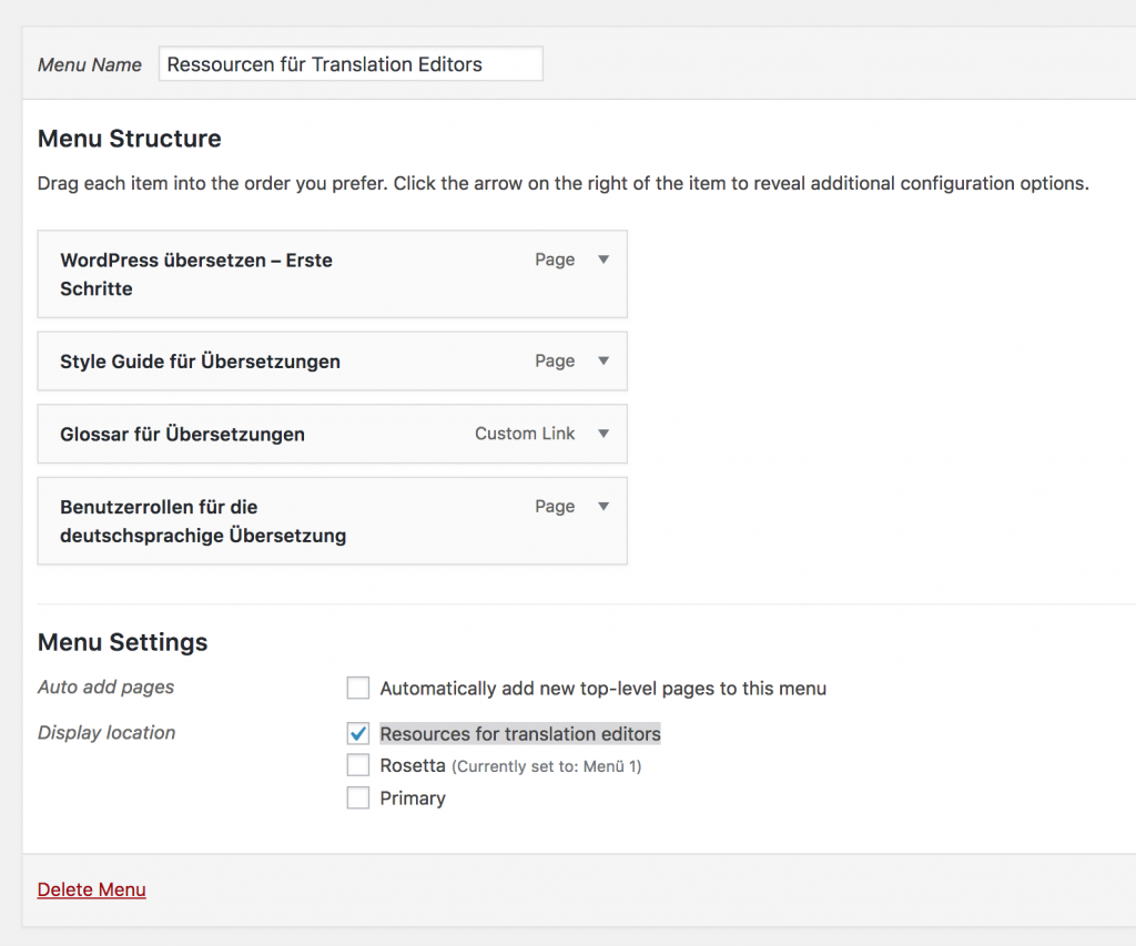 The email includes a list of the projects (name + link) and some other links to help them get started. Besides the default links, each locale team can extend the email with other helpful resources. To do that, you have to create a new navigation menuNavigation Menu A theme feature introduced with Version 3.0. WordPress includes an easy to use mechanism for giving various control options to get users to click from one place to another on a site. in the admin of your Rosetta site and assign it to the Resources for translation editors menu location.