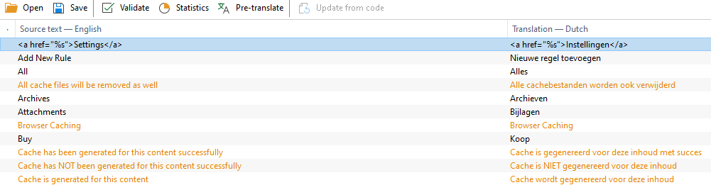- If you see a yellow warning sign next to one (or more) of your translations in Poedit, this means something is wrong with the translation.