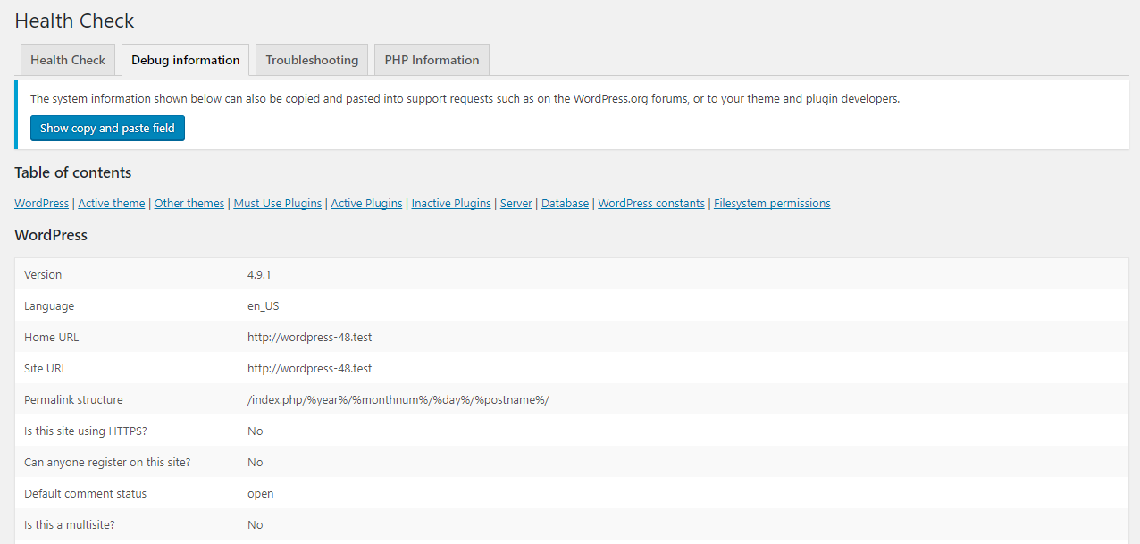This page also provides the user with a field for easily copying this information over into a support topic on the WordPress.org support forums (or to their plugin or theme providers support form if they wish). This section can be accessed by clicking the Show copy and paste field button at the top of the page.