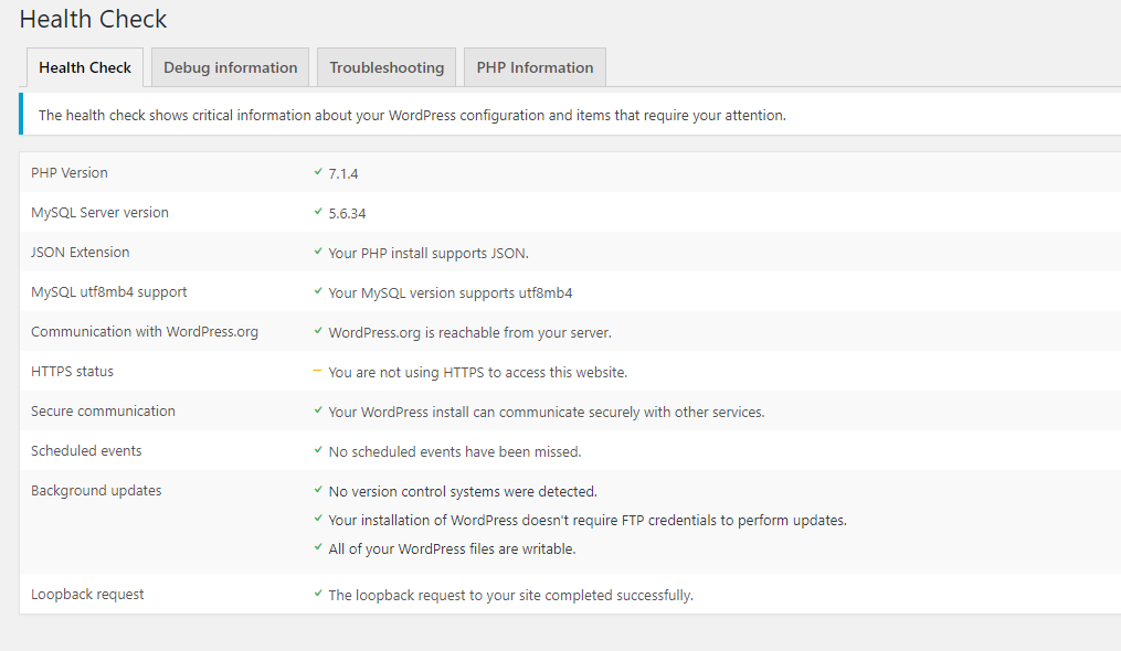 - Background updates: A suite of tests to check if anything is preventing WordPress from automatically applying minor updates (security/bugfix updates).