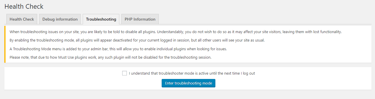 It also allows you to switch between a default theme, and your currently active theme (the one you were using on your site before enabling troubleshooting mode), and of course gives you a way to disable troubleshooting mode.