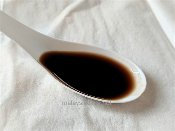 色は茶色と黒の中間という色合いで、垂らした時のテクスチャーはわりとさらさらとして軽めです。さらっとした黒蜜みたいな色合いと感触でした、と表現したくてこの写真を撮ってから気が付きましたが、これ、ペナンのアッサムラクサに乗ってくるあの茶色のえびソースにも見えますね(笑)