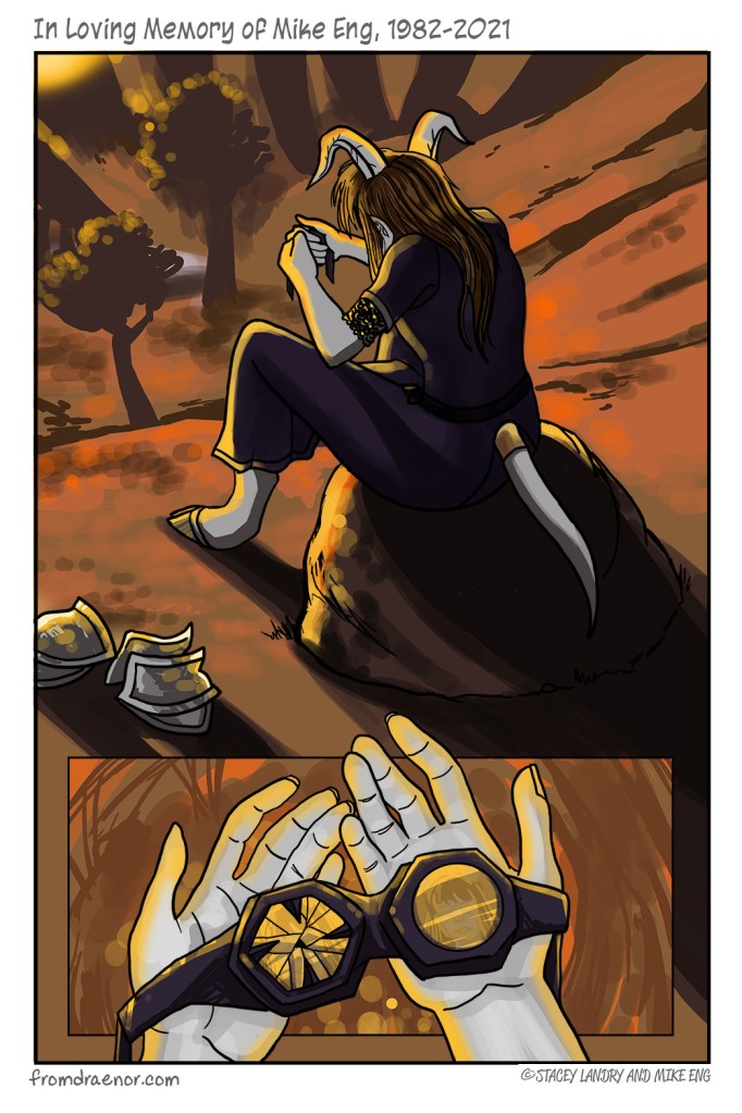 Those of you who followed From Draenor with Love know that the site hasn’t been working for a few years now. Mike and I struggled with the technical aspect of running a site together, and it got hacked and we never got it working again. Our mutual friend Sean has been able to get a site working in the last week, I haven’t shared it publicly yet because I wanted to give him a chance to get it going. Right now there’s a landing page here: From Draenor With Love. As Mike passed away unexpectedly, the last week has been pretty awful for all of the people who loved him (and there are a lot). I am writing this post about what Mike was to me, but there could be 100 posts like it written by different people. That’s the kind of person he was. I was really floundering with my grief. I’ve never lost anyone so close to me, never lost someone I considered a best friend. Another of Mike’s friends, Tommy, told me that when he lost a friend he wrote a song about it and it helped him. My version of that is to write this, and also to literally haul my Cintiq out of storage so that I could make one last page of FDWL. It hasn’t been added to the site yet, but eventually it will live on the last page. It is, as you can imagine, deeply personal. I hope sharing it is cathartic to someone, at least it has helped me.