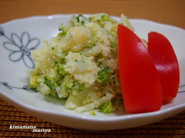 ☆ じゃがいもは皮をつけたまま洗い、ラップをかけてレンジで加熱。皮をむいてつぶします。ブロッコリーはやわらかくゆで、大まかに刻みます。Aであえます。