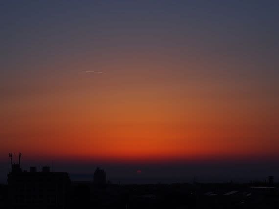 冷たい風の中、春らしい茜色の夕暮れ。