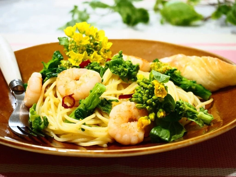 たっぷりの菜の花と、ぷりぷりのえびでスパゲティ。