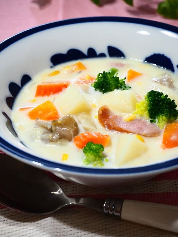 じゃがいも、玉ねぎ、にんじん、ソーセージやベーコンを炒め、水(ひたひたの量)、洋風スープの素を加えて煮、クリームコーン缶、牛乳 (or豆乳)を注いで弱火で煮立てます。塩、こしょうで味を調えます。