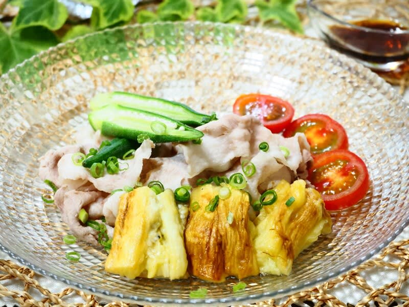 焼きナスとゆで豚のポン酢しょうゆがけ