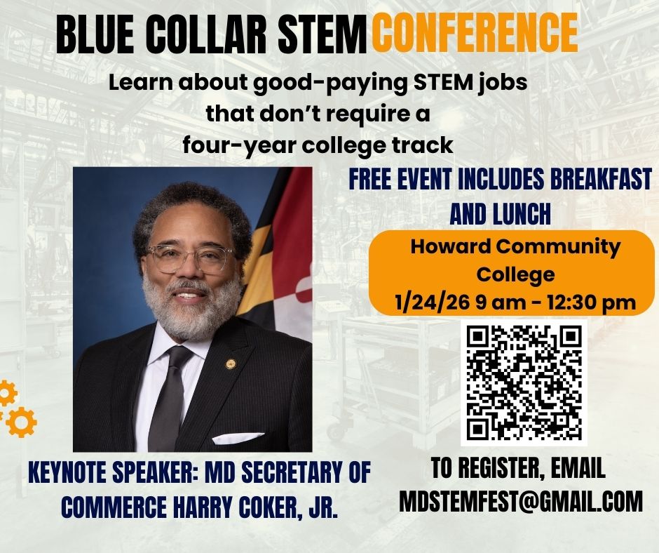TLearn about good-paying STEM Jobs for everyone. They don't all require a four-year college degree or an extensive background in STEM. Secretary of Commerce Harry Coker, Jr will be the Keynot Speaker. Details at https://marylandstemfestival.org/blue-collar-stem-conference-and-job-fair/
