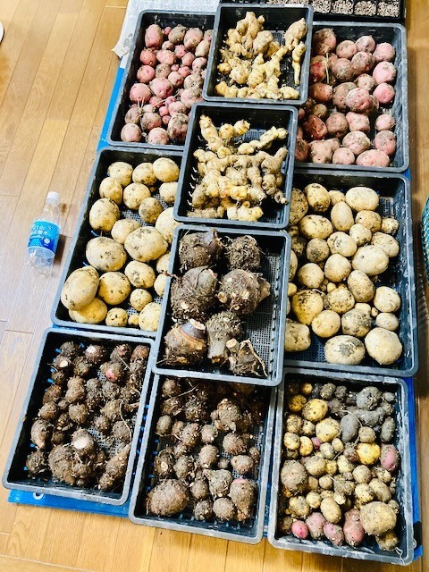 最低気温が氷点下となり、霜が降り始めました。イモ類・ショウガは「霜が降りる前に収穫しましょう」とのこと。あわてて収穫。