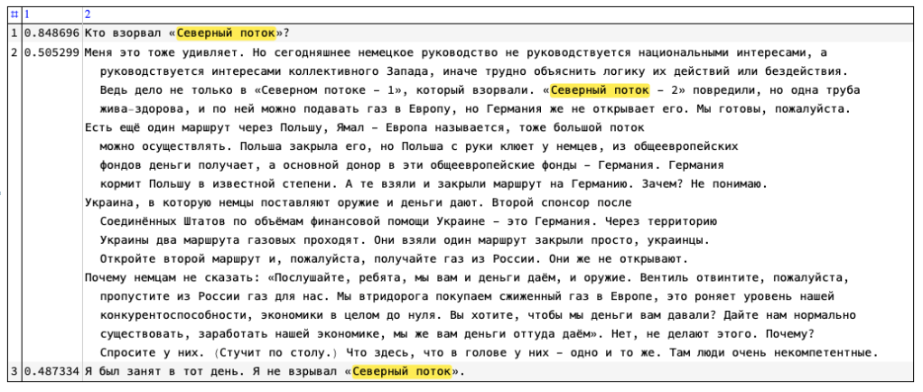 TopParts["Кто взорвал NordStream 1 и 2?", 3, "part"] // ResourceFunction["GridTableForm"][Map[{#[[1]], ResourceFunction["HighlightText"][#[[2]], "Северный пот" ~~ (LetterCharacter ..)]} &, List @@@ #]] &