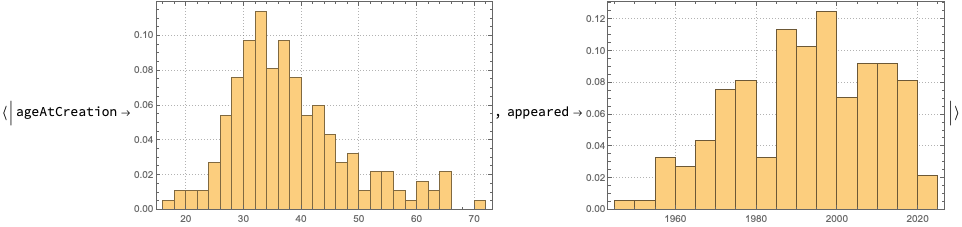 (*{{<|"appeared" -> 2017, "ageAtCreation" -> 33, "numberOfUsersEstimate" -> 420|>, 2}, {<|"appeared" -> 2023, "ageAtCreation" -> 39, "numberOfUsersEstimate" -> 11|>, 1}, {<|"appeared" -> 2022, "ageAtCreation" -> 55, "numberOfUsersEstimate" -> 6265|>, 1}}*)
