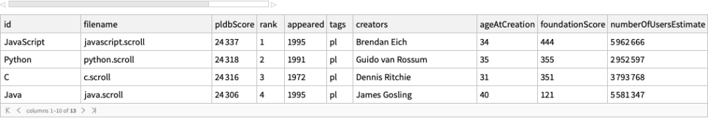 dsDataVar = dsData[All, {"appeared", "ageAtCreation", "numberOfUsersEstimate", "numberOfJobsEstimate", "rank", "measurements", "pldbScore"}];