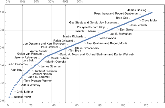 Here is the Pareto principle plot of for the number of created (or renamed) programming languages per creator (using the WFR function ParetoPrinciplePlot):