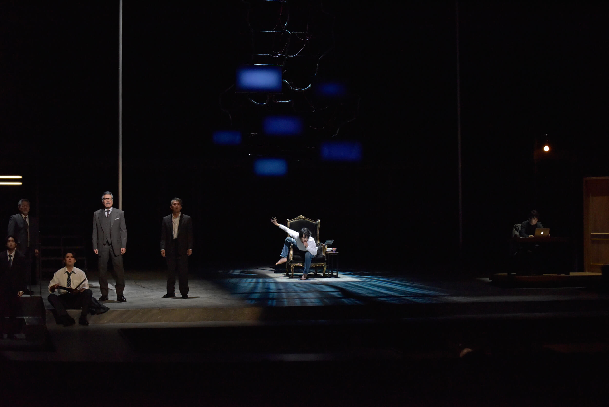 問題定義がなされたところで、オーケストラピットからレムとリュークが現れた。彼らは人間界を見下ろしながら、愛に左右され真実を見ることができない愚かな人間たちを歌う。濱田のレムは湿度が高く、気だるさすら感じさせる。