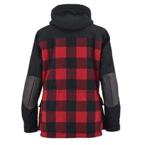 身頃はブロックチェックメルトン生地、別地に光沢を抑えた伸縮性のあるポリエステル生地を採用。