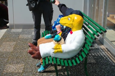 恐竜が腰掛けたベンチも。恐竜博士ダイノベンチです。