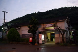 17時15分過ぎに本日最後の駅舎撮影。昭和11年10月の開業時からの木造駅舎が健在で、他駅より屋根が高いような気がします。右脇には新しいタイプのトイレが設けられています。駅前は静かな集落で、小ぢんまりとした大衆食堂があります(やってたっけ?)。