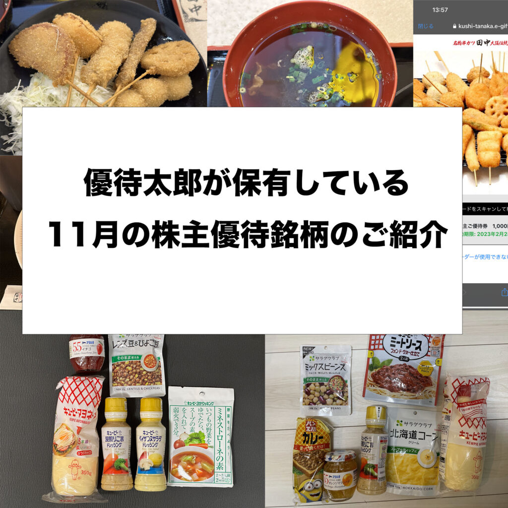 11月の株主優待のご紹介 キユーピーや串カツ田中ホールディングス、トーセイの株主優待が権利月です。