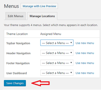 Step 3 ) The following image Manage Locations shows you the different locations you can add a menu in ClassiPress 4.1.0. All you have to do is select the menu you want to assign to the theme location. There are 4 theme locations.