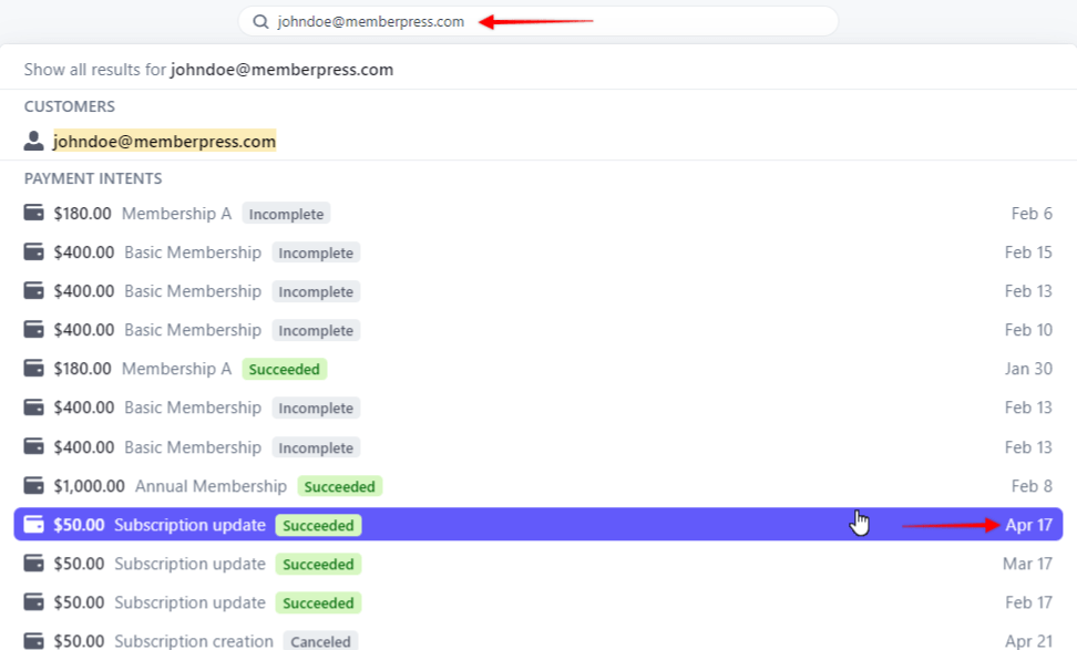 - Cuando se busque utilizando la dirección de correo electrónico del usuario, los pagos aparecerán en la lista bajo Intenciones de pago. Busque el pago que necesita utilizando la información que ya tiene sobre el pago que falta de este usuario (fecha de compra, importe, etc.);