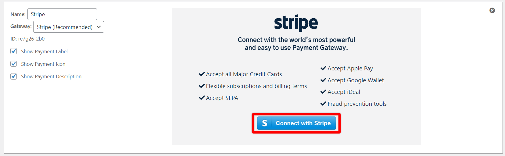 - Haga clic en el icono azul "Conectar con Stripe" para iniciar el asistente de conexión;