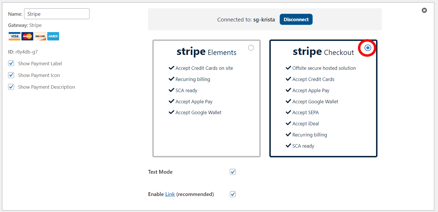 La única diferencia entre configurar Stripe Checkout y Stripe Elements es la casilla de arriba. Si desea utilizar Elements, simplemente marque la casilla Stripe Elements en lugar de la casilla Stripe Checkout.