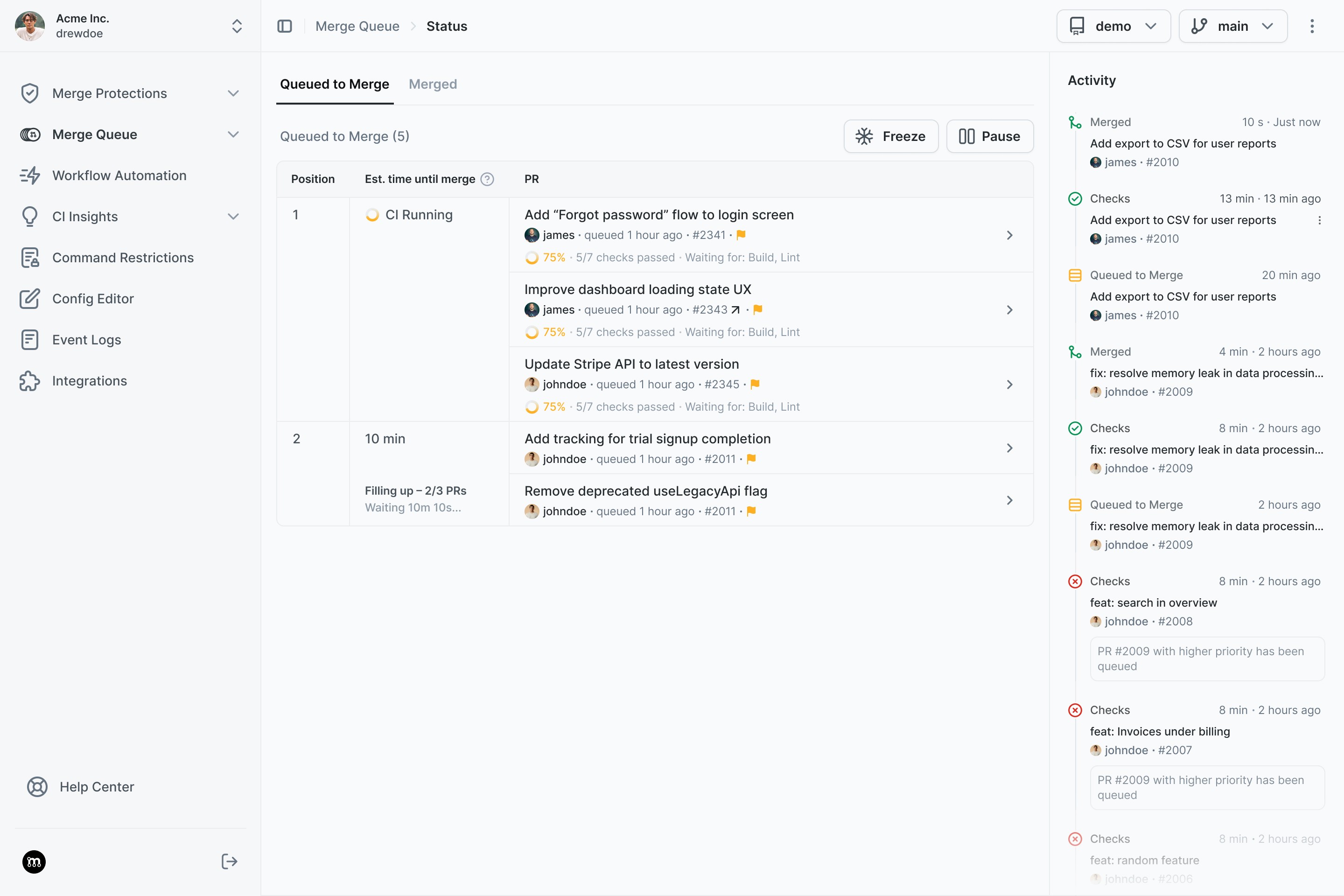 Assigns priorities to let hotfixes jump the queue. Pause or freeze merges safely during incidents