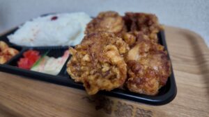 お弁当は数量限定で通常5種類あるのですが、この日寝坊してしまい開店から1時間後の到着で残り三つでした。画像は購入後です。