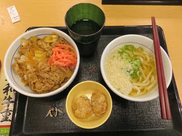 本日のランチ「なか卯:和風牛丼並・小はいからうどん、唐揚げ2個付」490円