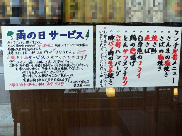 雨の日と、午後1時過ぎには、小鉢3品チョイスの「4品定食」となります。