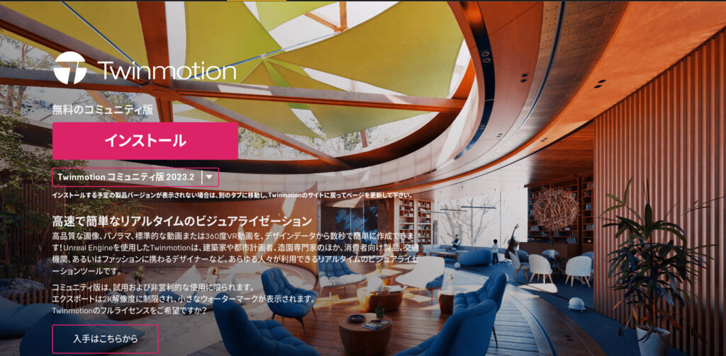 ビジュアライゼーション(静止画や動画制作)に特化して、Unreal Engineをより簡単なソフトウェアにしたものがTwinmotionです。