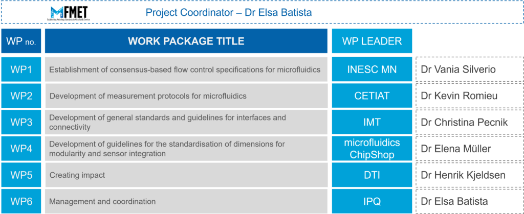 The Joint Research Project – 20NRM02 MFMET, Establishing metrology standards in microfluidic devices, funded under the EMPIR program of the European Commission, started in June 2021 and lasted for three years involving 15 partners, including: 7 National and Designated Metrology Institutes (IPQ – Portugal, CETIAT – France, LNE – France, Tubitak – Turkey, DTI – Denmark, CMI – Czech Republic and RISE – Sweden), 4 companies (IMT – Switzerland, microfluidics ChipShop – Germany, Bronkhorst High-Tech – The Netherlands and EnablingMNT – The Netherlands) and 4 Research Institutes (INESC MN – Portugal, HSG-IMIT – Germany, CEA – France and University of Glasgow – United Kingdom)