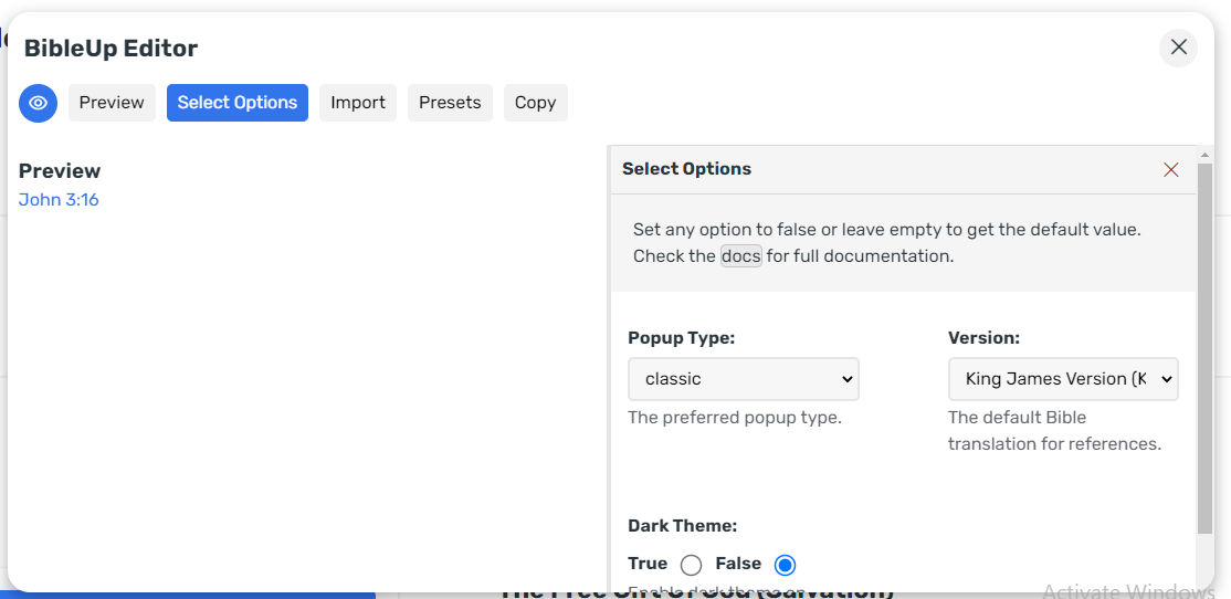 BibleUp transforms all Bible Reference on a page into hyperlinks, hovering or clicking on these links will display the corresponding Bible text via a feature-rich and highly customizable popover.