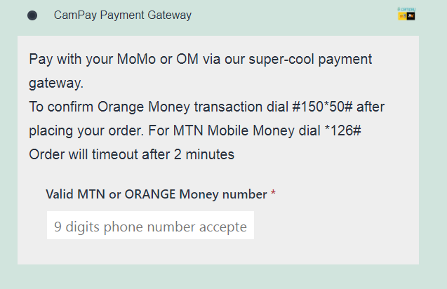 • Input phone number to use for the payment (it must be a 9 digits valide MTN or Orange phone number)