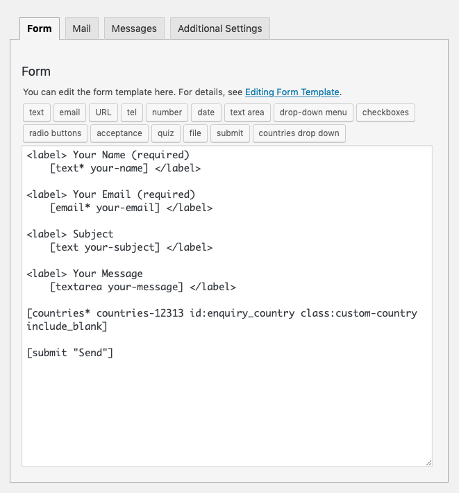 cf7-countries.phpto the/wp-content/plugins/directory - Activate the plugin through the ‘Plugins’ menu in WordPress