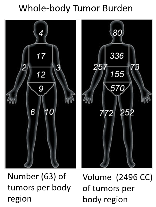 Each WBMRI scan was acquired using a 1.5 Tesla MR scanner with integrated body coil, and no intravenous contrast. Each subject was imaged from head to ankles in the supine position. The entire body was imaged using a coronal fat suppressed fluid sensitive sequence (STIR). The image sizes vary between 320X1000X20 and 400X1200X40. Each scan is saved in a single file (.nii) in NIFTI format, which is converted from de-identified DICOM files.