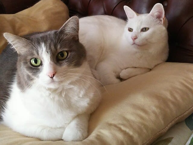 我が家のミミ(奥の白ネコ)とモモ(手前のキジネコ)