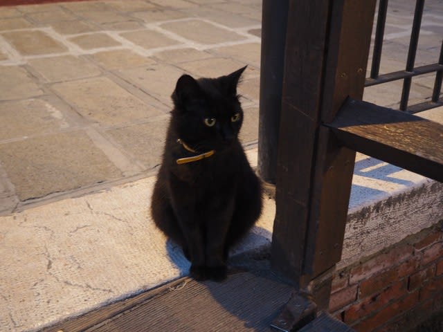 夜のブラーノ島を散策していると、運河のそばでたたずんでいる黒ネコを発見!