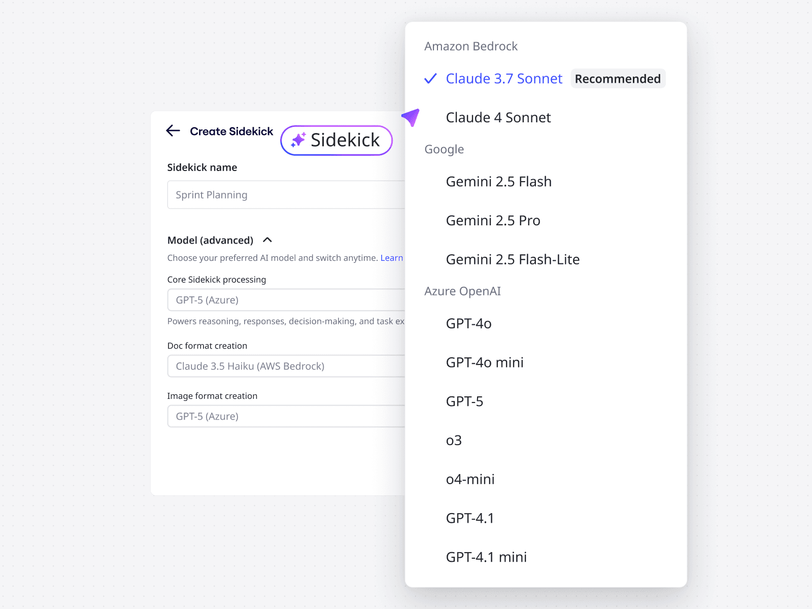 Elige el modelo de IA que mejor se adapte a la tarea: desde el trabajo principal de tu Compañero de IA, hasta la redacción de documentos o la creación de prototipos y videos. Cambia el modelo cuando cambien las necesidades; tu Compañero de IA sigue siendo el mismo.