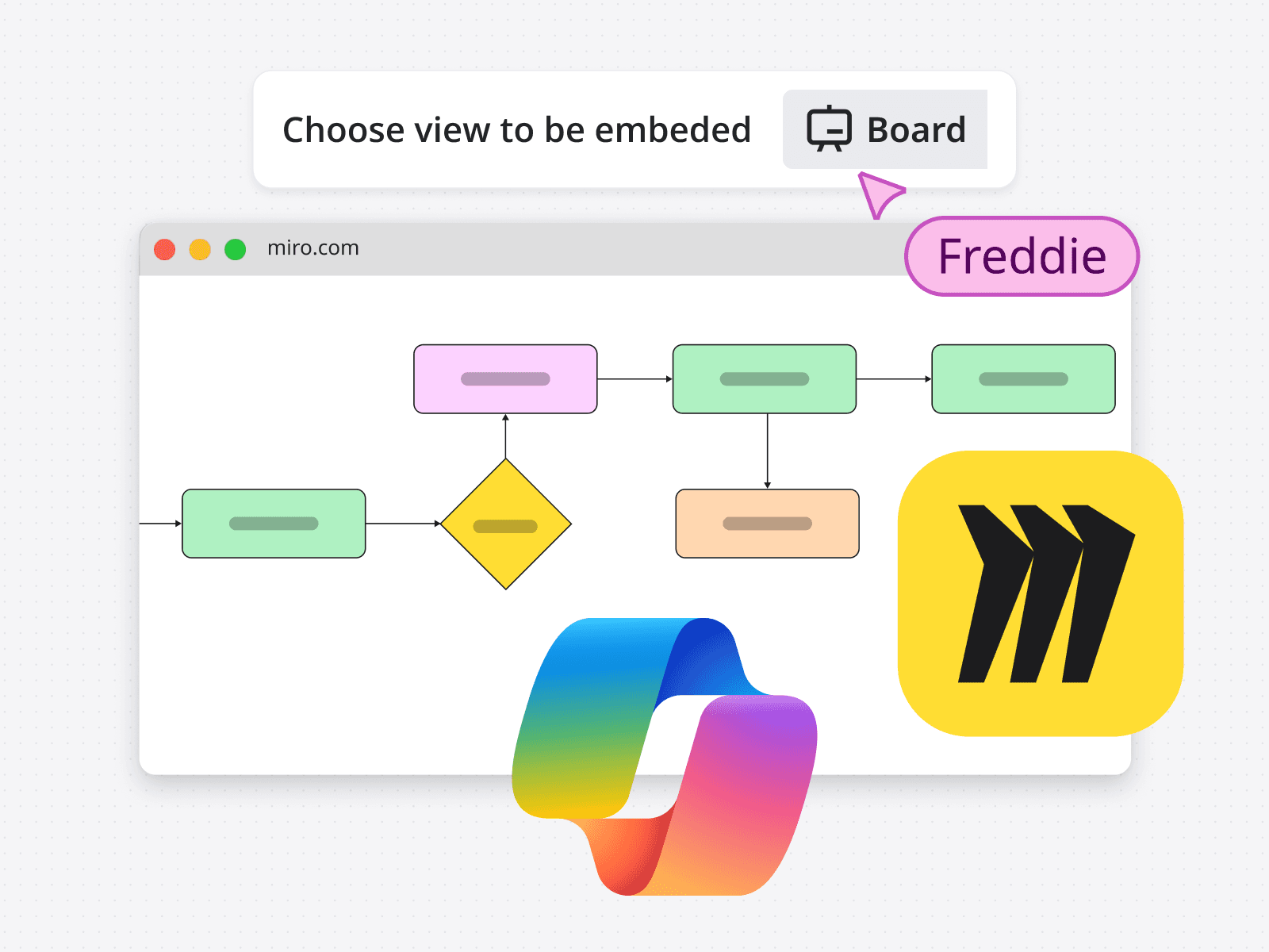 Uzyskaj więcej korzyści z inwestycji w Copilot, łącząc wiedzę i innowacje. Zespoły mogą przekształcać czaty z Copilot i wiedzę korporacyjną w bogate diagramy i dokumenty w Miro. Lepszy kontekst – lepsze wyniki.