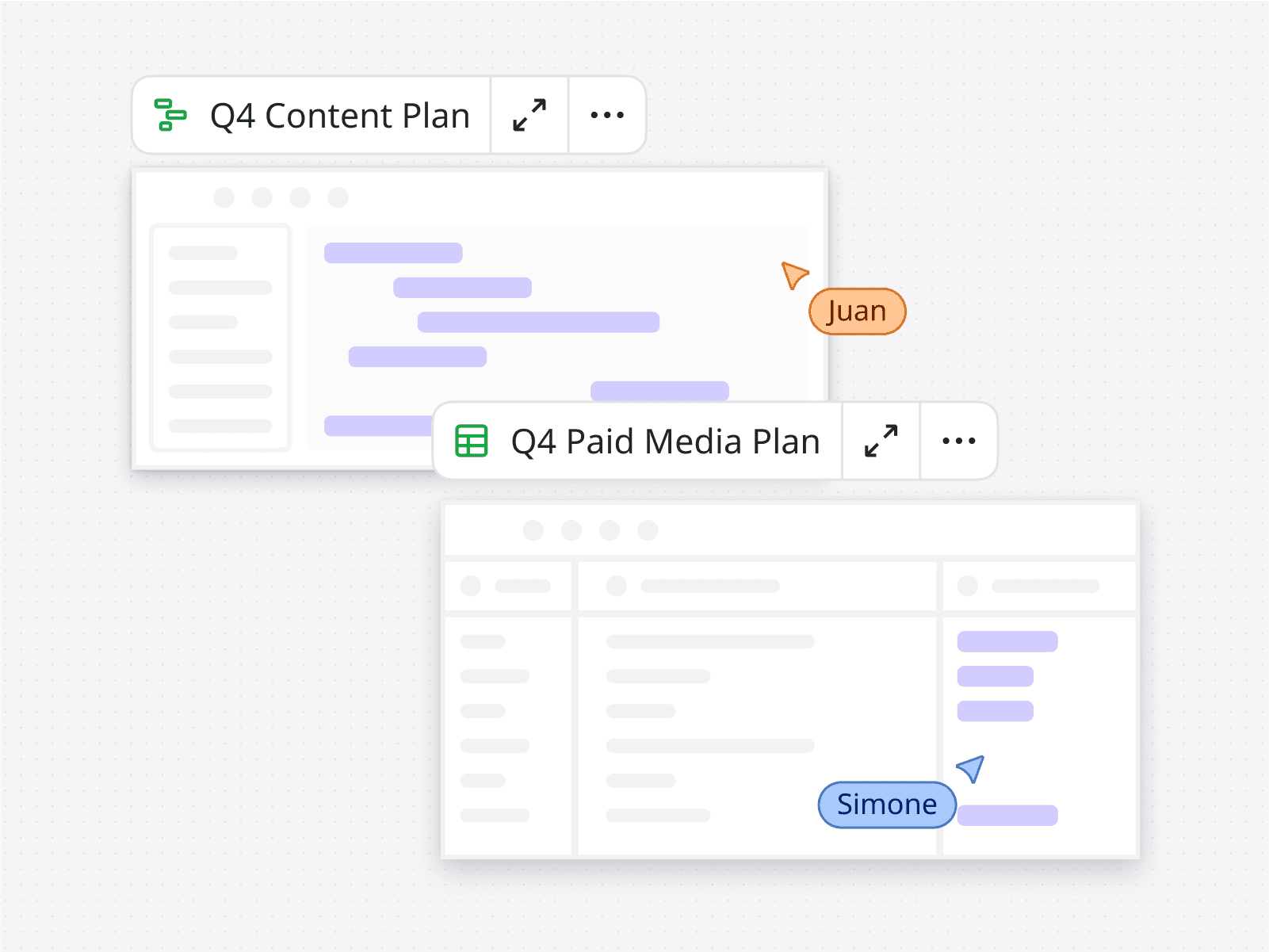 Keep campaign strategy and execution in one visual workspace with AI assistance. Drag-and-drop tasks, assets, and content onto the canvas alongside embedded docs and creative files. Stop context-switching between spreadsheets and emails, and start executing on your best ideas fast.