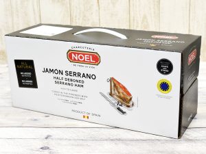こちらがコストコのチルド食品コーナーで見かけるNOEL『骨なしハモンセラーノ*』(品番:14147)。内容量は900g。生ハムのかたまりに台、ナイフが付属して、お値段は4,498円(税込)です。