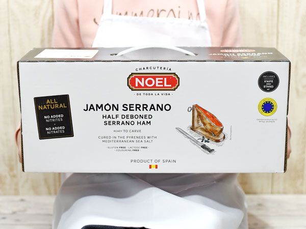 「ハモンセラーノ」は、スペイン産の生ハムのこと。イタリア産の場合は「プロシュート」と呼ばれます。本品はスペインのメーカーNOEL製。ピレネー山脈で12ヵ月熟成させたものなんだそう。添加物は一切入っておらず、原材料は豚もも肉と食塩のみです。