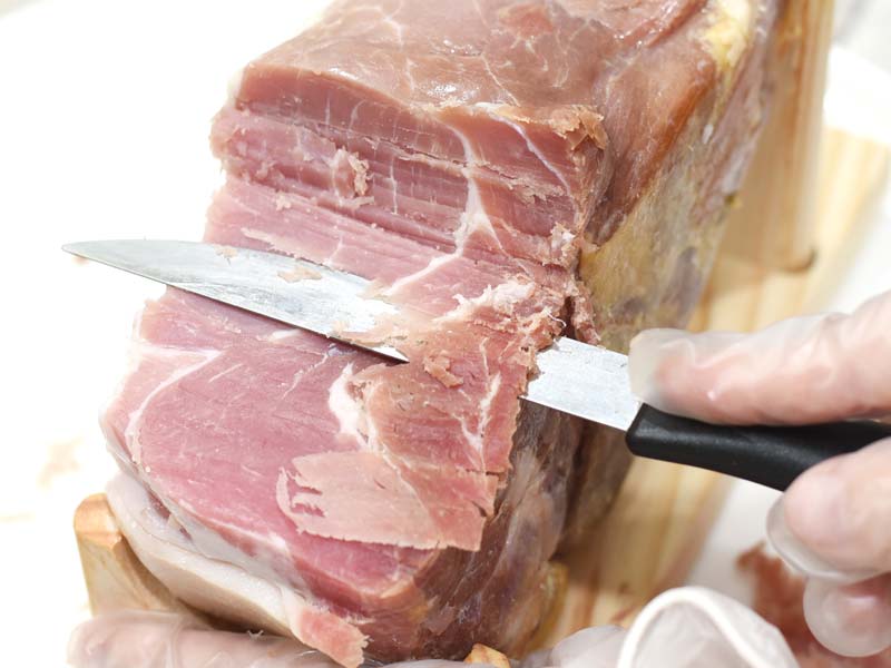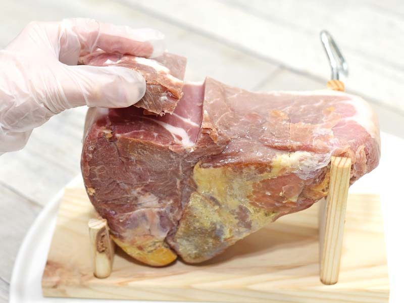 今回も、『骨なしハモンセラーノ(約2kg)』で紹介した方法に沿って進めます。表面をカットして、取り分けておきましょう(保管時に断面を覆うフタとして使用)。また、サイドの脂は適宜トリミングしていきます。