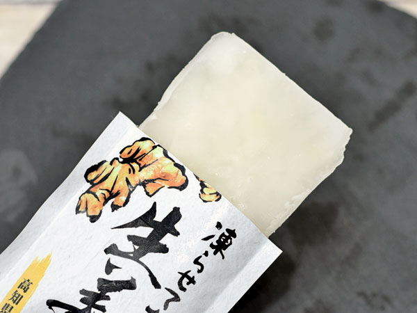 さて、パッキパキに凍らせたのがこちら。パクつくと……辛っ。生姜のツンとした香りがピリリィッとした辛みとともにお口に広がります! これは、ガチのジンジャーエールを飲んだときと似たテイスト。刻んだ生姜が入っておりまして、そいつが効いてるんですね。水飴的甘みの中にも、はっきりとした生姜の辛み。商品名のとおり、まさに “大人の” 味でしょう。好きな人は相当にハマるはず。酒呑みとか好きそう。
