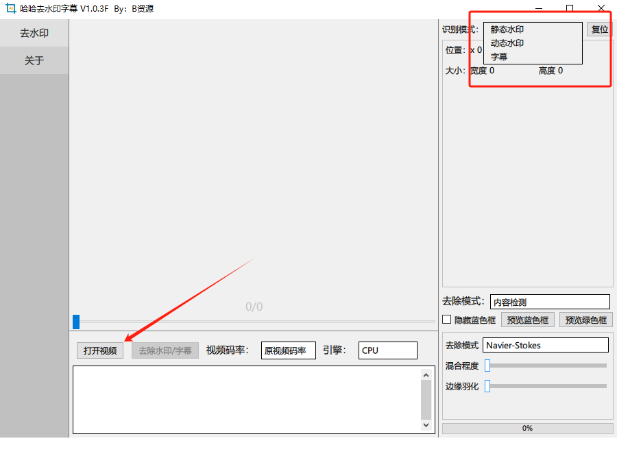 打开软件,界面简洁又直观,各项功能按钮清晰排列,即使是新手也能快速上手。【打开视频】的按钮醒目易找,点击后就能导入想要处理的视频。在识别模式区域,静态水印、动态水印、字幕三种模式一目了然,任你按需选择。