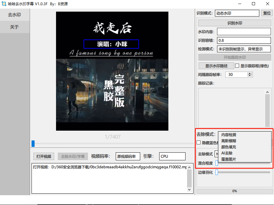 选好后点击【识别水印】,在左边视频窗口框选水印内容,软件便开始逐帧识别。识别后,去除模式选项丰富,内容检测、高斯模糊、颜色填充、AI 去除、覆盖图片等一应俱全。